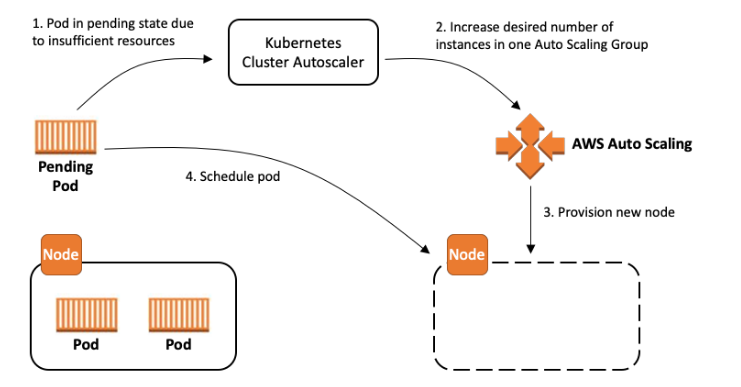 - Finally, the pending pods are scheduled on the new nodes that come up.