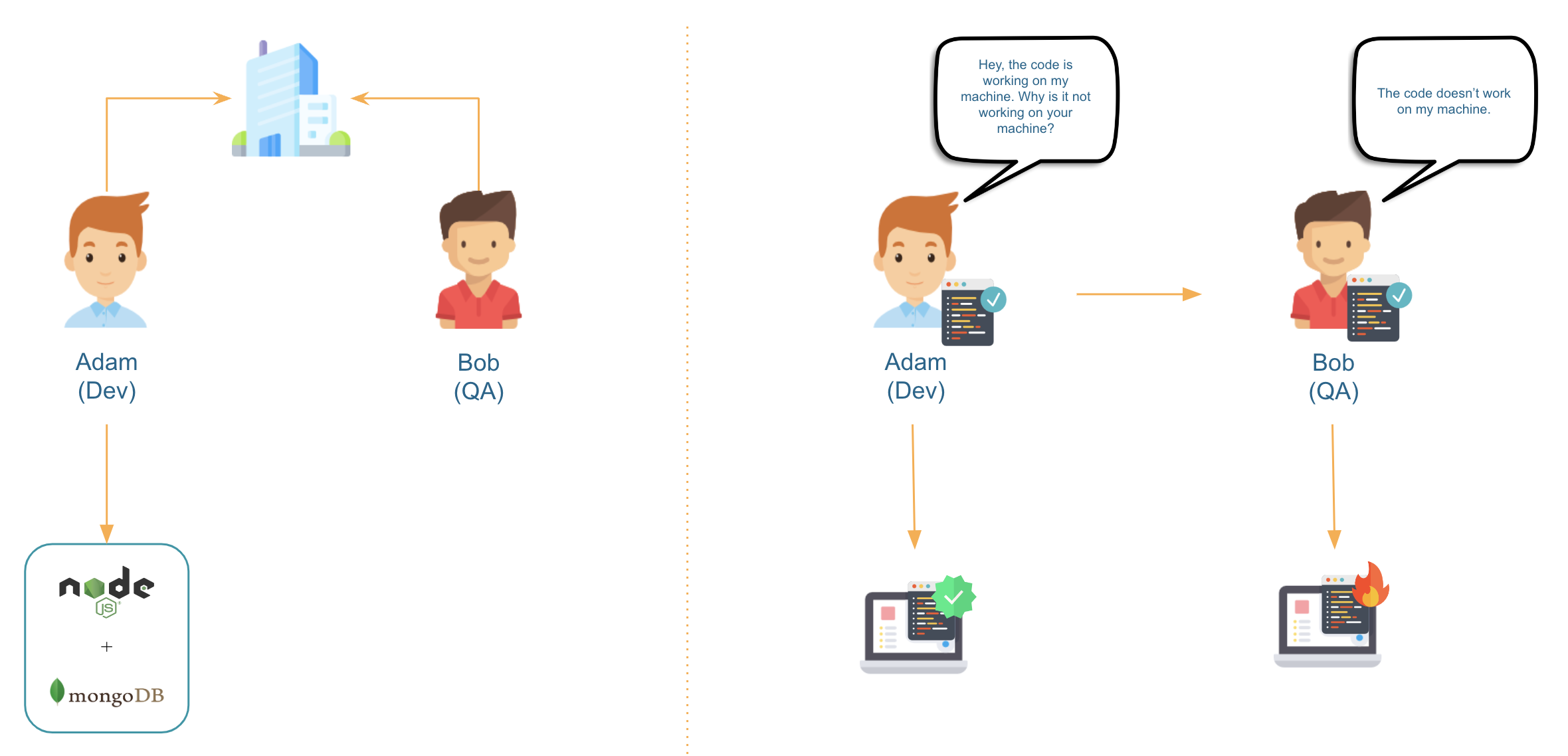 Adam scratches his head and goes to Bob, saying, "Hey, the code is working fine on my machine. Why the hell isn't it working on yours?”