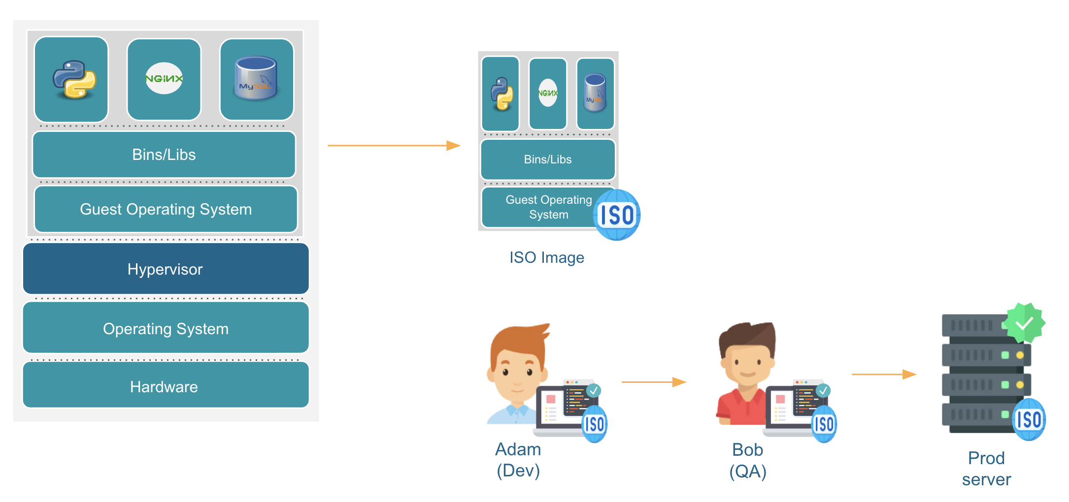 Remember Adam and Bob? Here's the update on their story. The smart DevOps team used VMware to create a virtual machine. They added things like Node.js and MongoDB plus other stuff it needs. Then, they made a copy of everything - that's the image. They gave this image to Adam and Bob, and guess what? The same image will be used for production too.