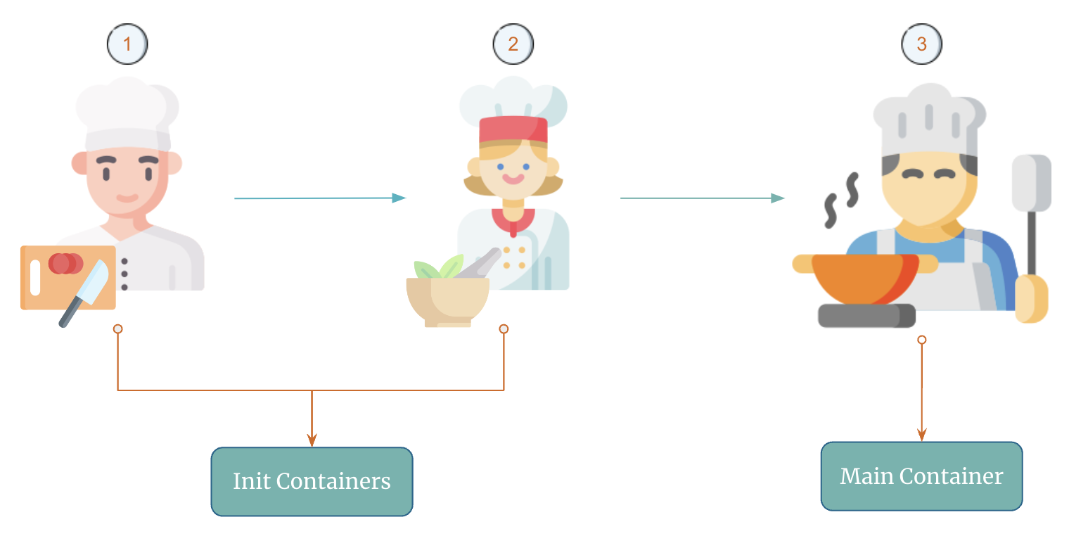 Restaurant: Kubernetes ClusterKitchen: PodSous chef or assistant: Init ContainersHead chef: Main Containers