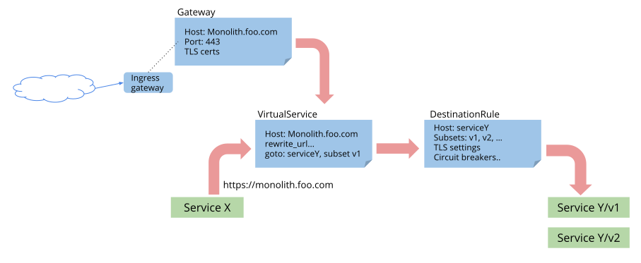 You can think of virtual services as how you route your traffic to a given destination, and then you use destination rules to configure what happens to traffic for that destination. Destination rules are applied after virtual service routing rules are evaluated, so they apply to the traffic’s “real” destination.